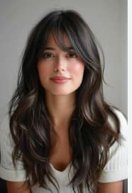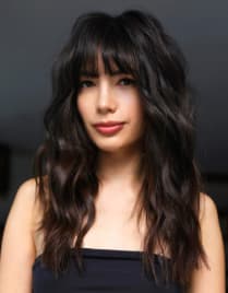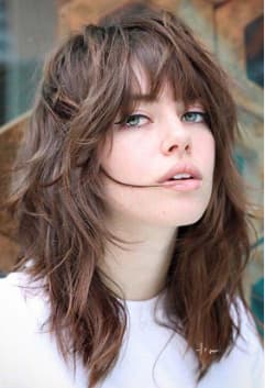 Flequillo largo llega hasta los pómulos y se distribuye de forma escalonada, enmarca el rostro y destaca las facciones, siendo muy versátil para diferentes estilos. No le queda al rostro triangular y alargado.